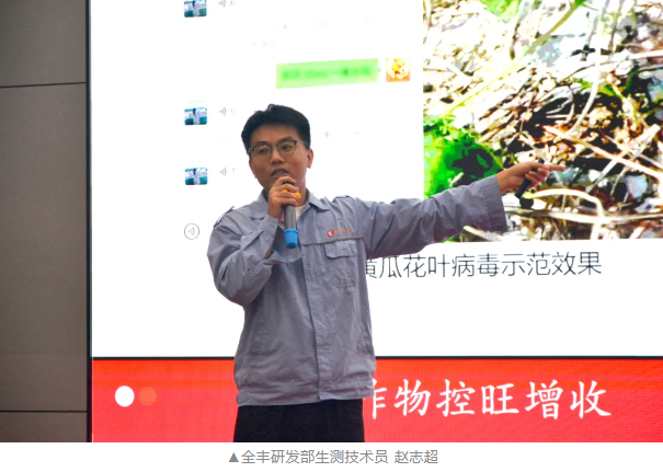 全豐研發部生測技術員趙志超針對辣椒種植中令人頭疼的病毒病問題,進行了詳細的病理特性講解。他從病毒病的傳播途徑、發病癥狀等方面入手,讓大家對這一病害有了全面的了解。同時,重點介紹了氟芐硫縮誘醚在病毒病防治上的應用效果。通過實際案例和科學數據,展示了該產品在防治病毒病方面的卓越性能,為種植戶們提供了一把科技護航的利器。